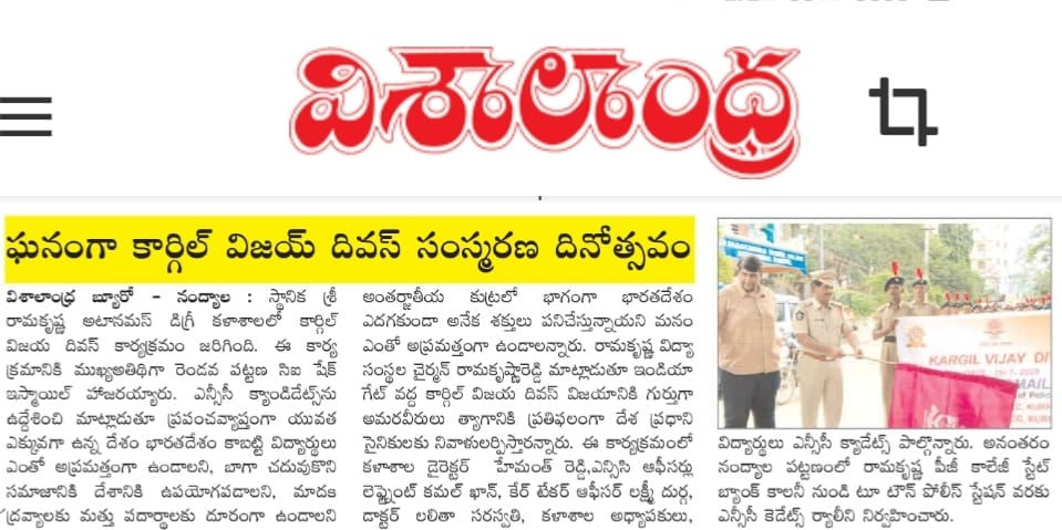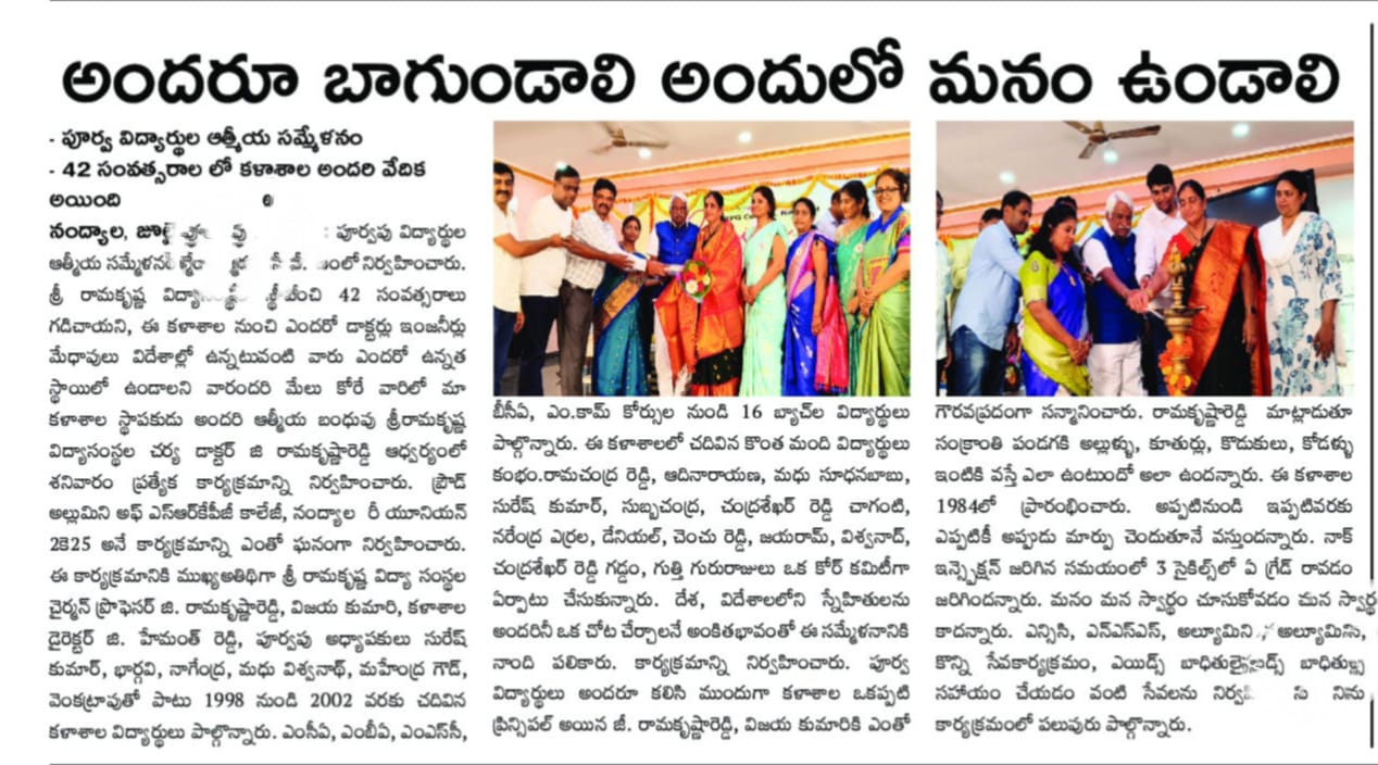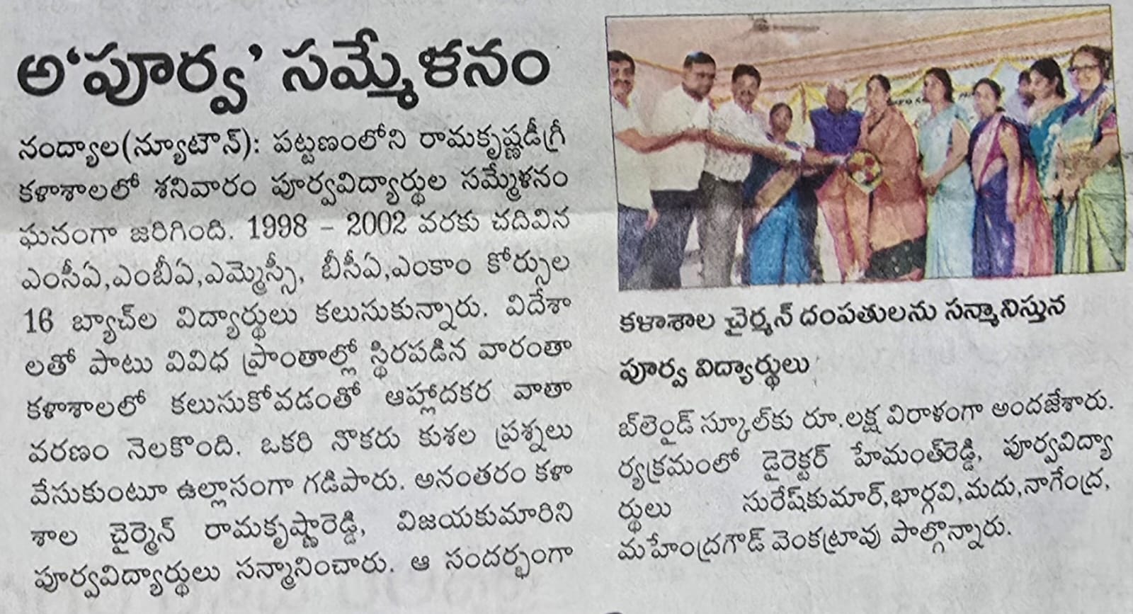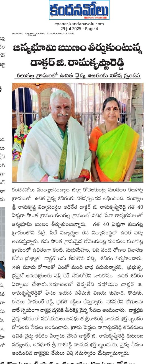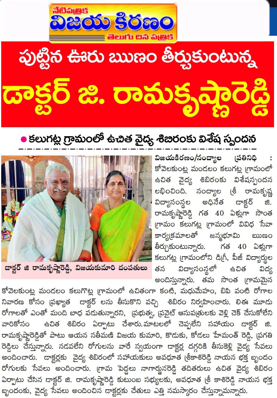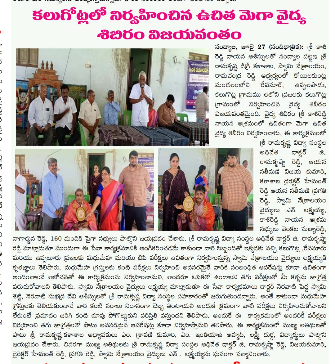 A mega free medical camp was organized under the joint auspices of Sri Ramakrishna Degree College, Nandyal, and Swami Netralayam, for the benefit of the residents of Revanoor, Uppalapadu, and Kalugotla villages in Koyalakuntla Mandal. The camp was conducted at the Sri Kashireddy Nayana Ashram in Kalugotla village.
