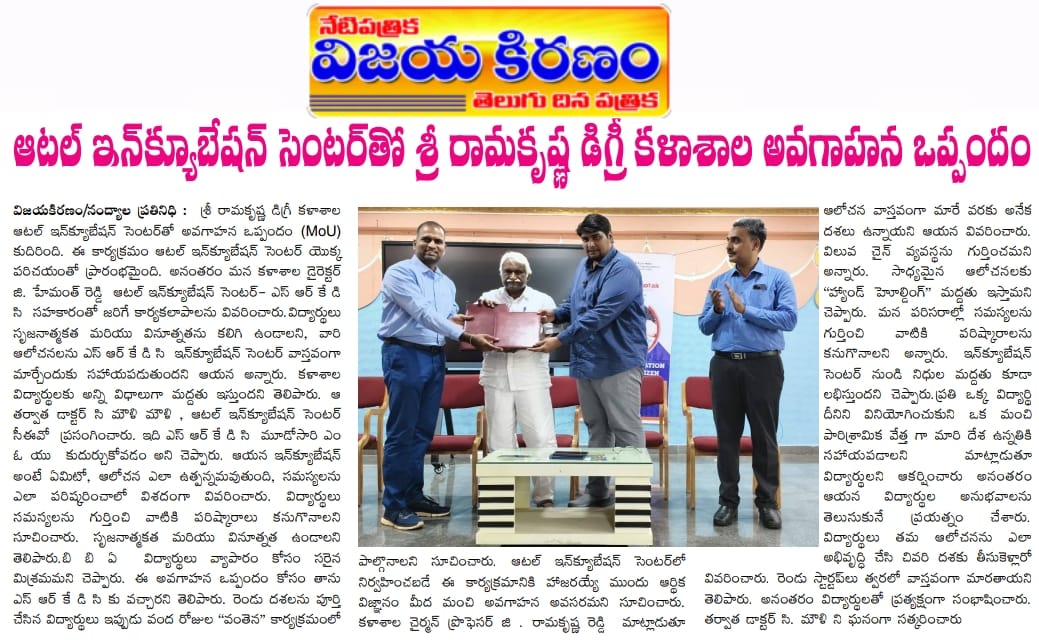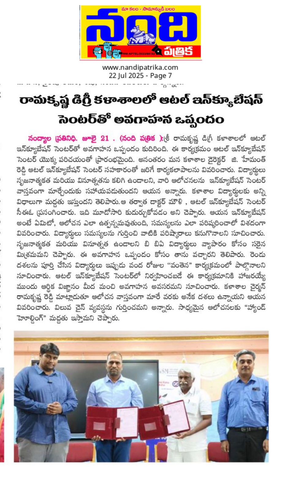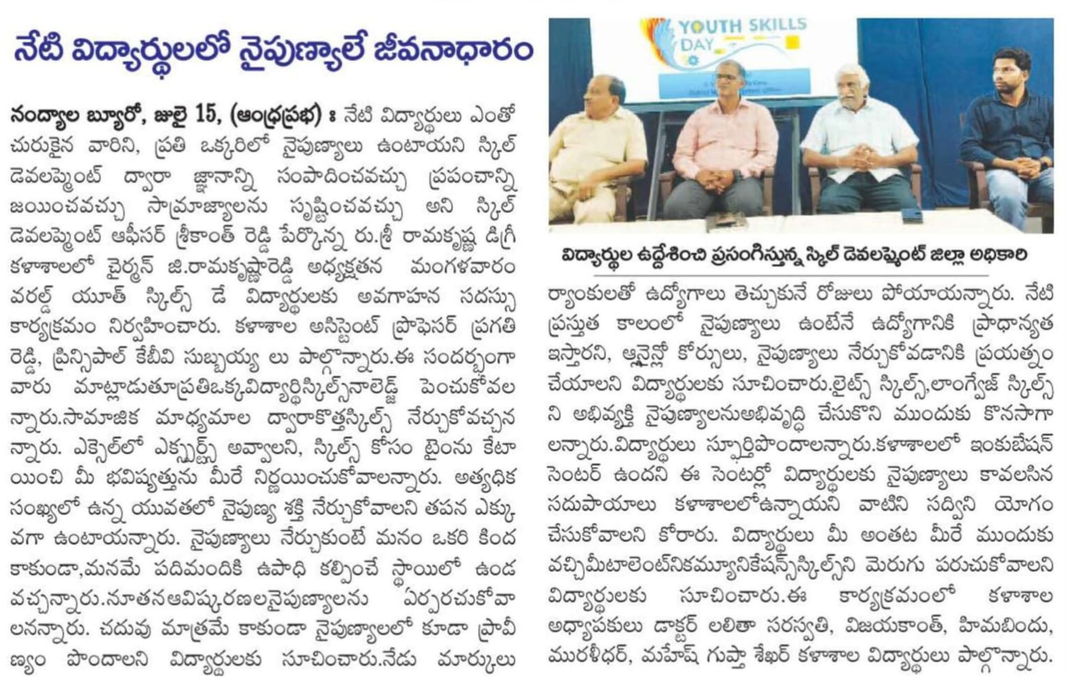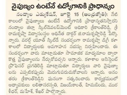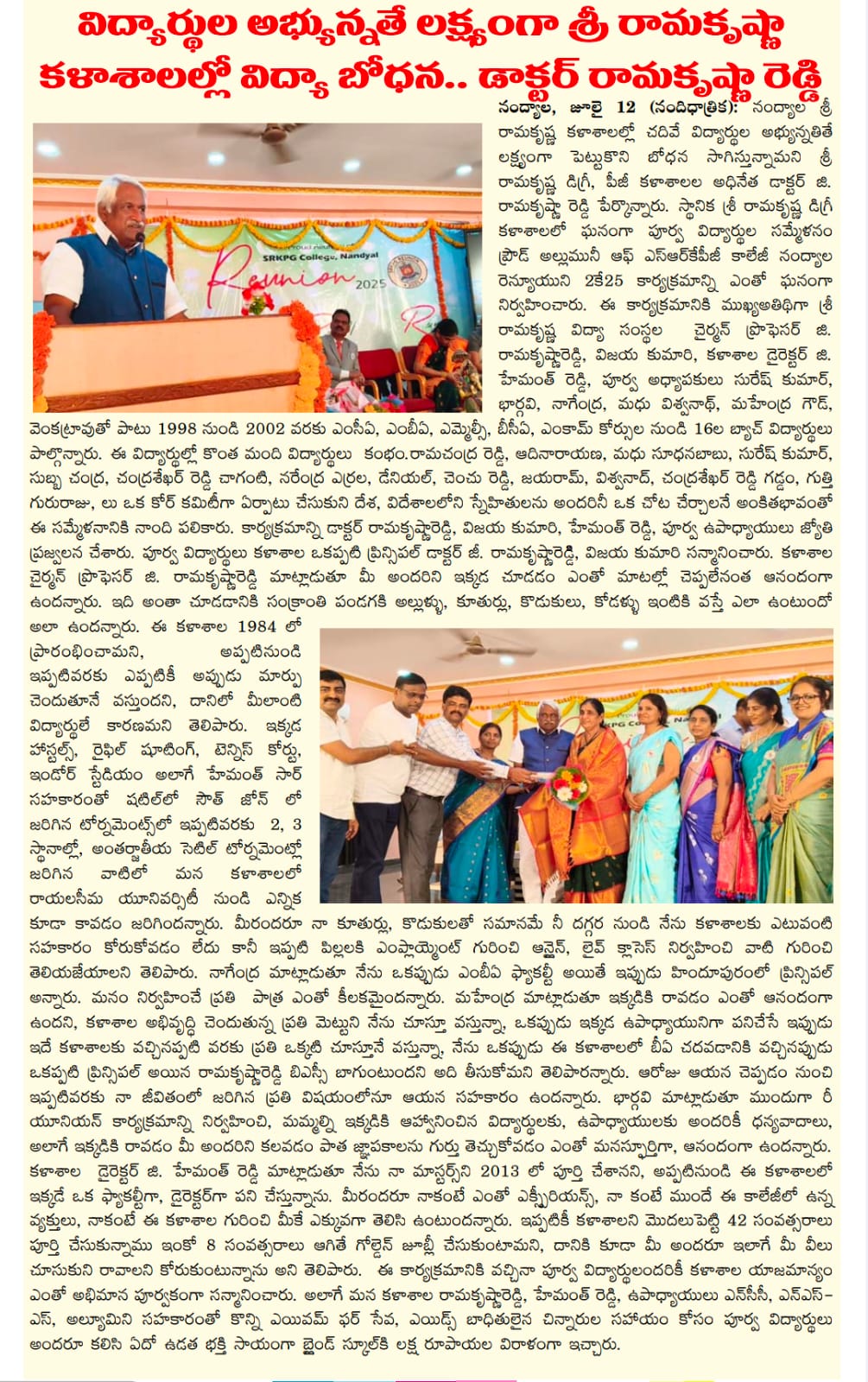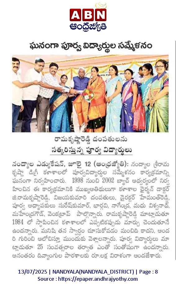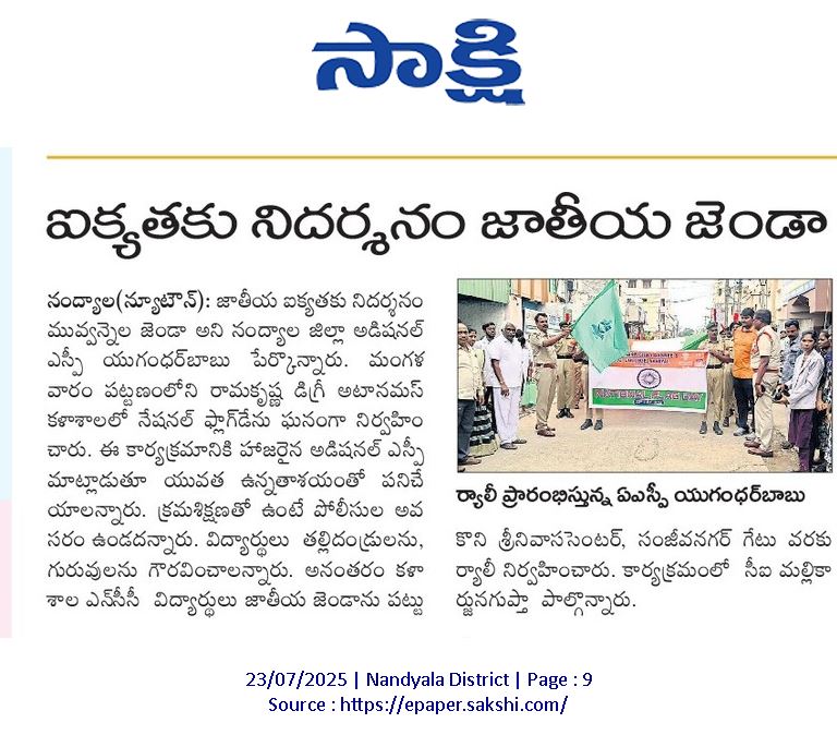 A mega free medical camp was organized under the joint auspices of Sri Ramakrishna Degree College, Nandyal, and Swami Netralayam, for the benefit of the residents of Revanoor, Uppalapadu, and Kalugotla villages in Koyalakuntla Mandal. The camp was conducted at the Sri Kashireddy Nayana Ashram in Kalugotla village.
