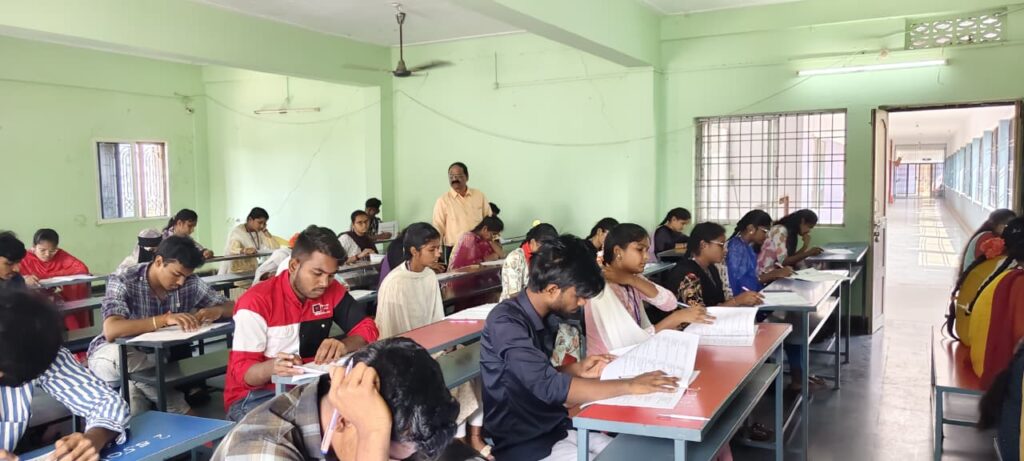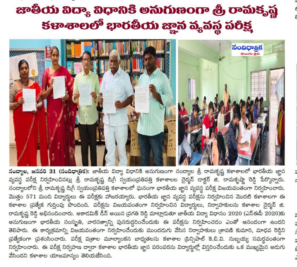 Today, the Indian Knowledge System (IKS) examination was successfully conducted at Sri Ramakrishna Degree Autonomous College, Nandyal. A total of 571 students appeared for this examination. The college has earned a special distinction as the first institution to conduct the Indian Knowledge System examination. The Chairman of the college, G. Ramakrishna Reddy, congratulated the students and the organizers for successfully conducting the examination. Academic Dean Pragathi stated that it is a matter of great happiness to conduct this examination in accordance with the National Education Policy 2020 (NEP 2020), with the aim of reviving and promoting Indian culture and heritage. Special appreciation was given to the organizers Mrs. Sravani Kumari and Mr. Madhava Reddy for taking the initiative to successfully organize this program. The responsibility of evaluating the examination papers was efficiently handled by the college Principal, K. B. V. Subbaiah. The college management stated that by conducting this examination, the institution has taken an important step towards spreading the tradition of Indian knowledge among students.
