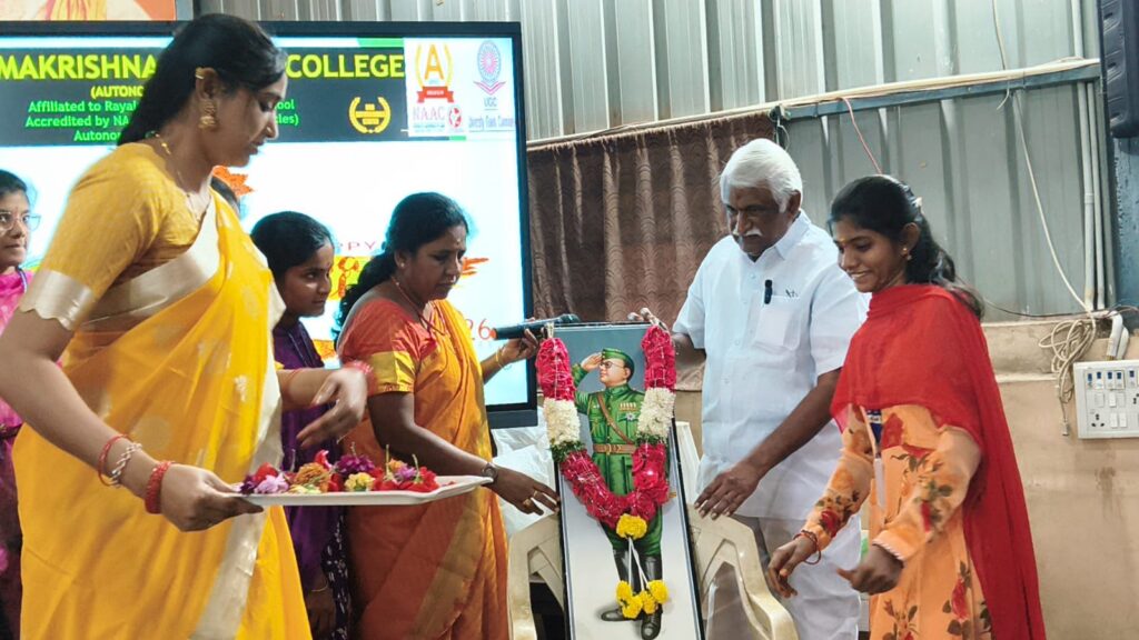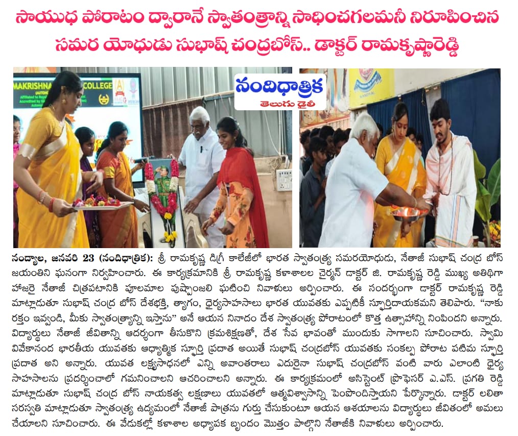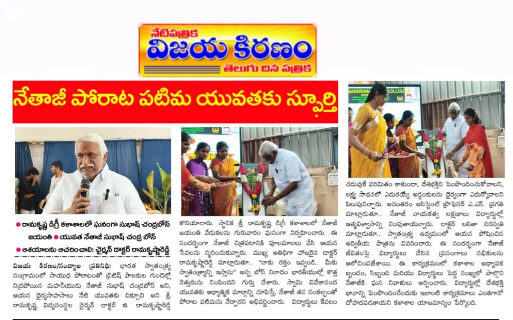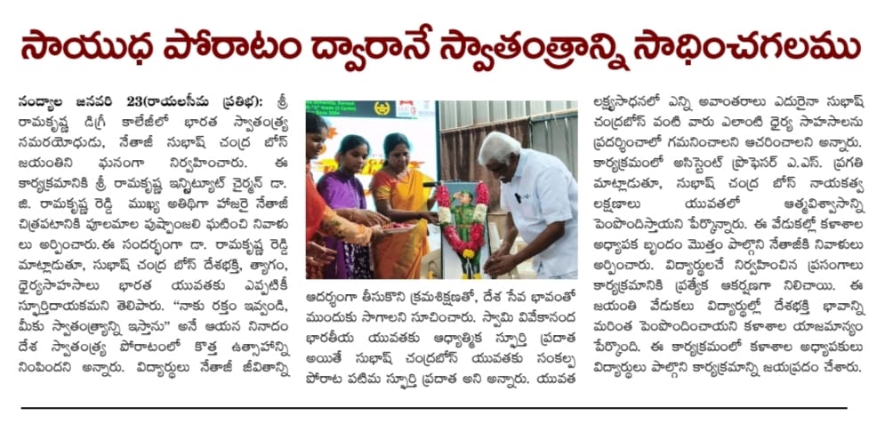 The birth anniversary of Netaji Subhas Chandra Bose was celebrated with great enthusiasm at Sri Ramakrishna Degree College. The programme was graced by Dr. G. Ramakrishna Reddy, Chairman of Sri Ramakrishna Institute, as the chief guest. He paid floral tributes to the portrait of Netaji and addressed the gathering.