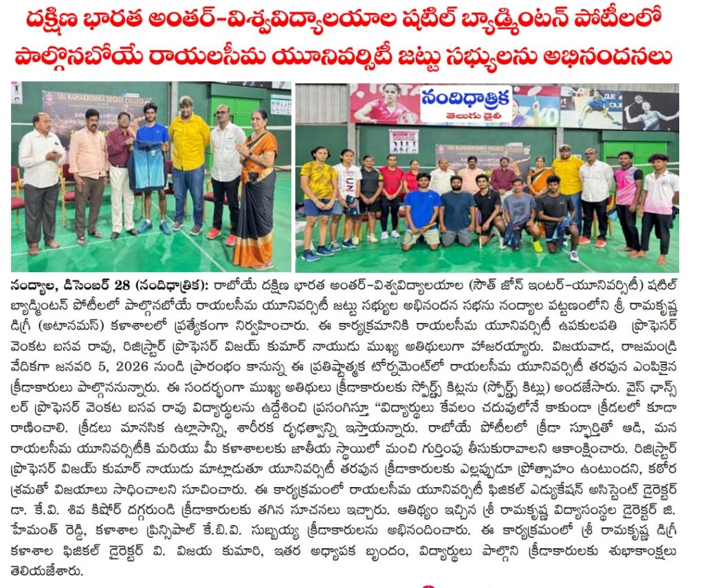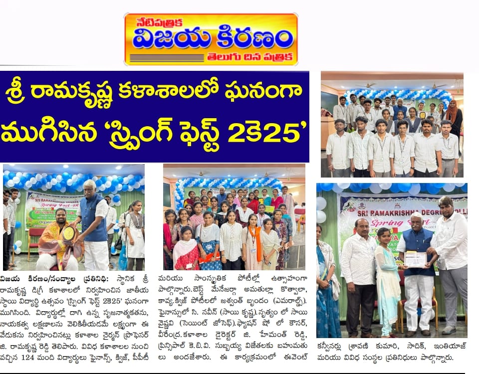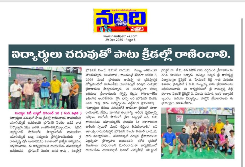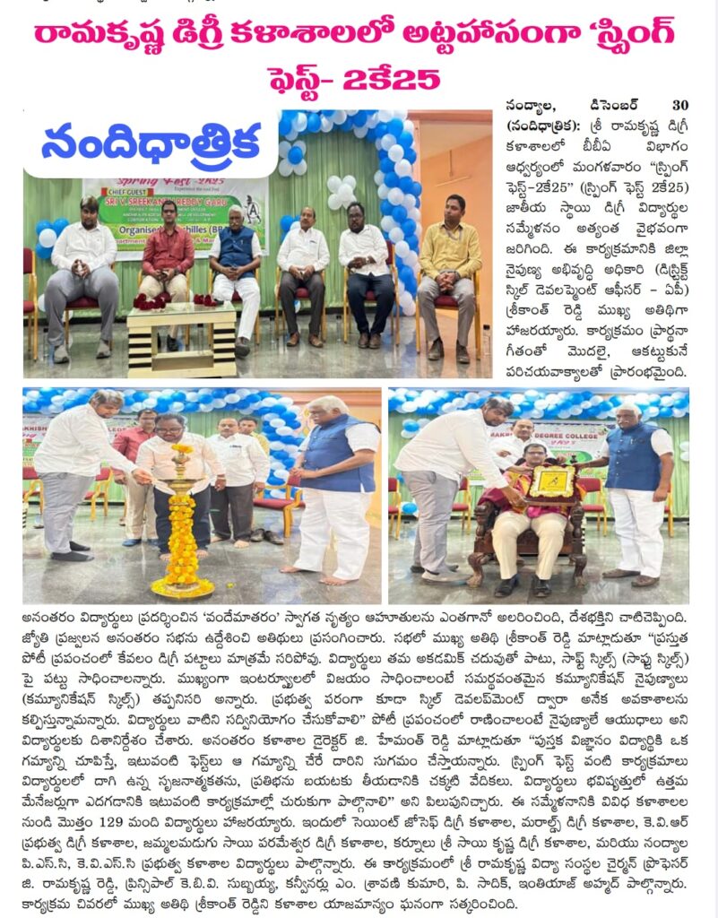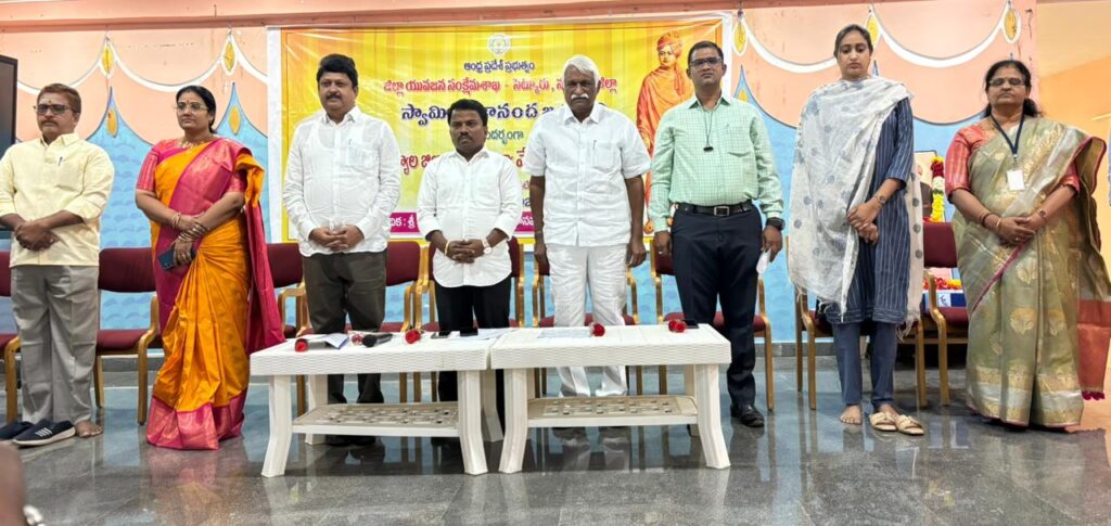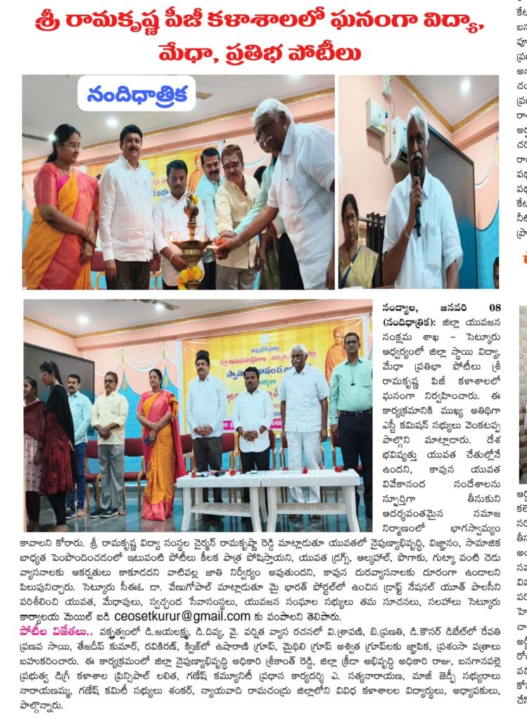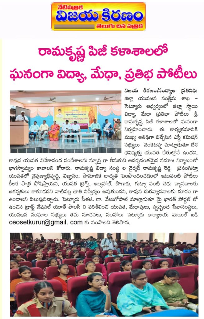 Under the aegis of the District Youth Welfare Department (SETKURU), district-level educational and intellectual talent competitions were held grandly at Sri Ramakrishna PG College. ST Commission Member Venkatappa, the chief guest, said the future of the nation lies in the hands of youth and urged them to draw inspiration from Swami Vivekananda’s messages to contribute to building an ideal society. Ramakrishna Educational Institutions Chairman Ramakrishna Reddy stated that such competitions play a key role in enhancing skills, knowledge, and social responsibility among youth, and appealed to them to stay away from drugs, alcohol, tobacco, and gutkha, which weaken the nation. SETKURU CEO Dr. Venugopal informed that suggestions on the Draft National Youth Policy available on the MY Bharat portal may be sent by youth, intellectuals, NGOs, and youth organizations to the SETKURU office email: ceosetkurur@gmail.com