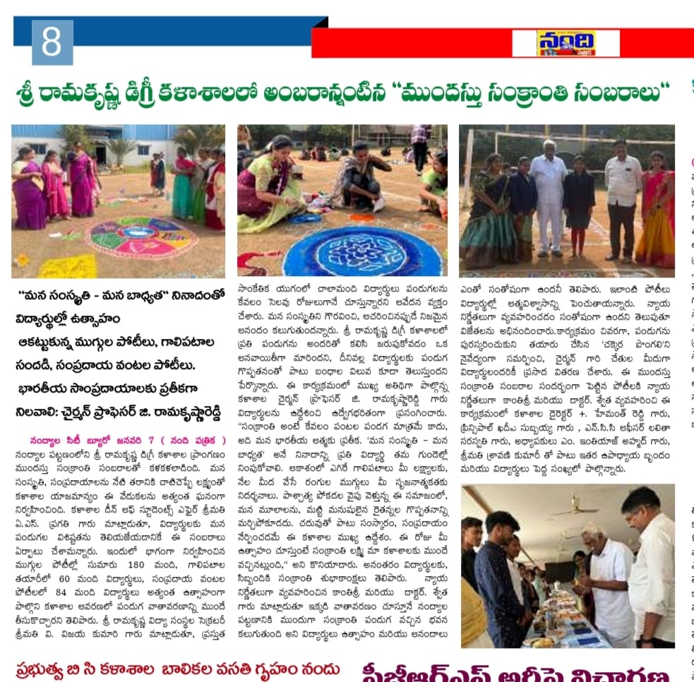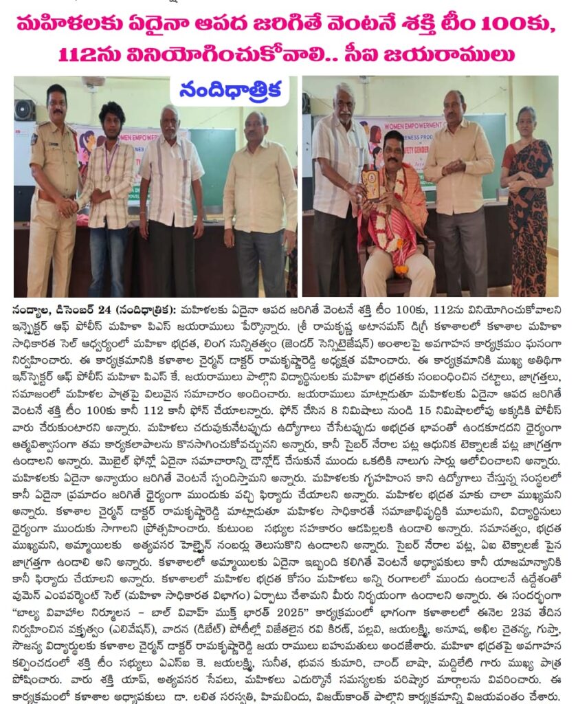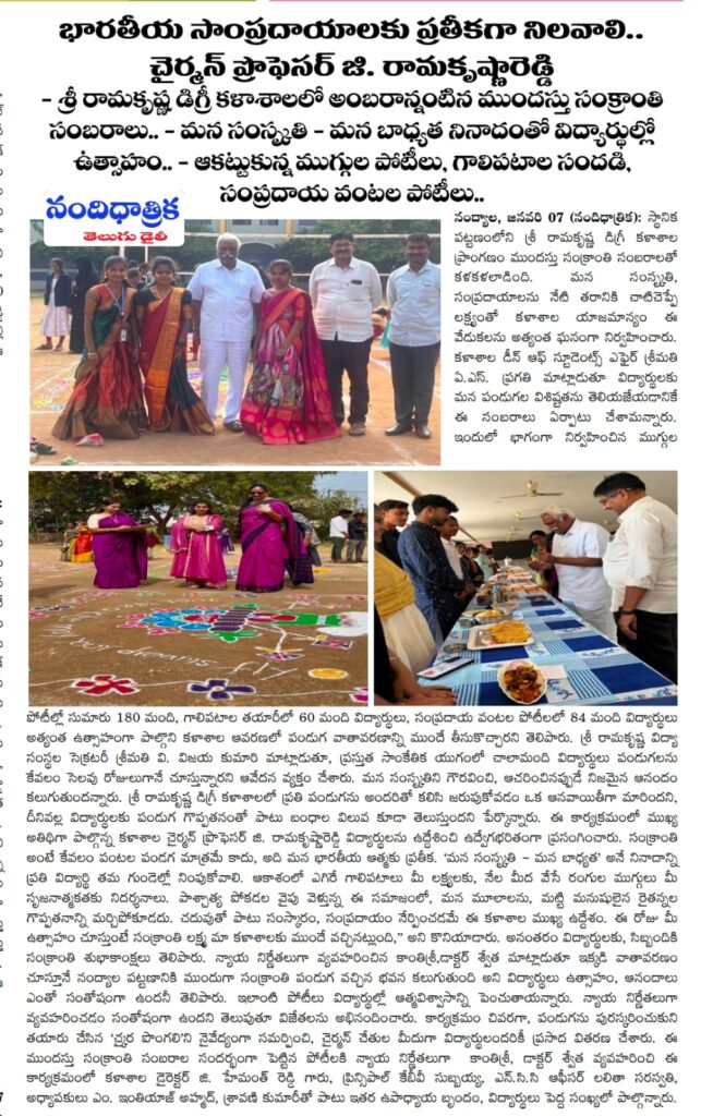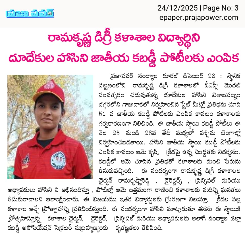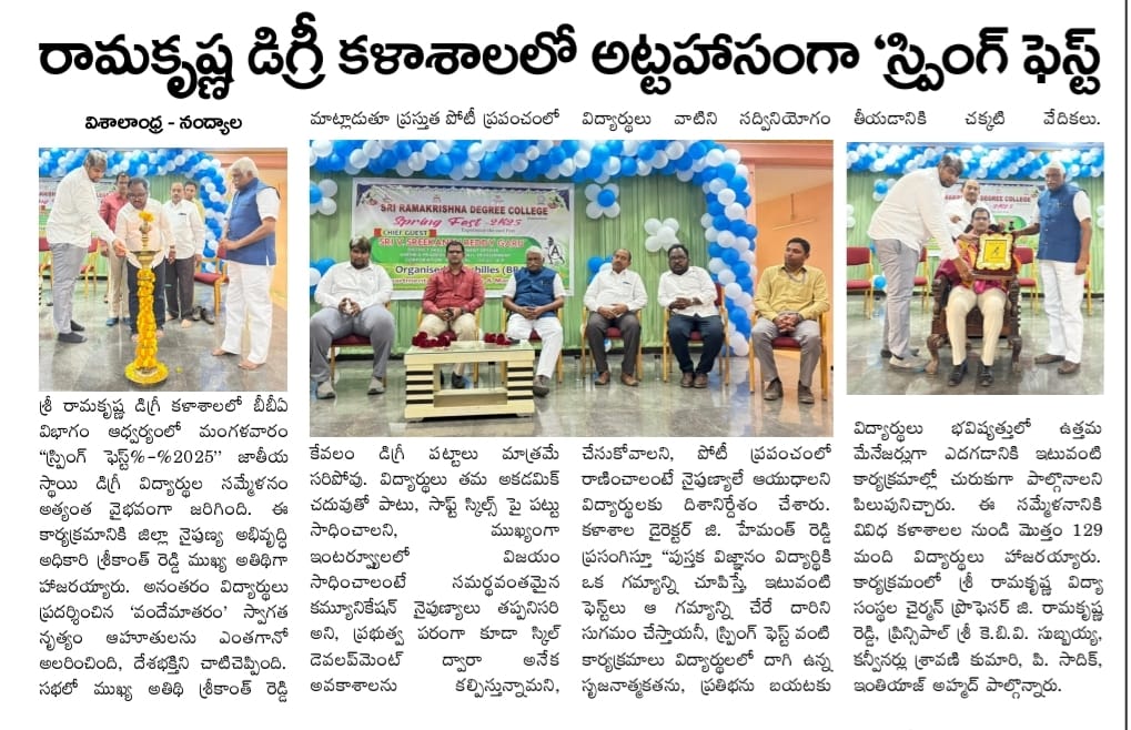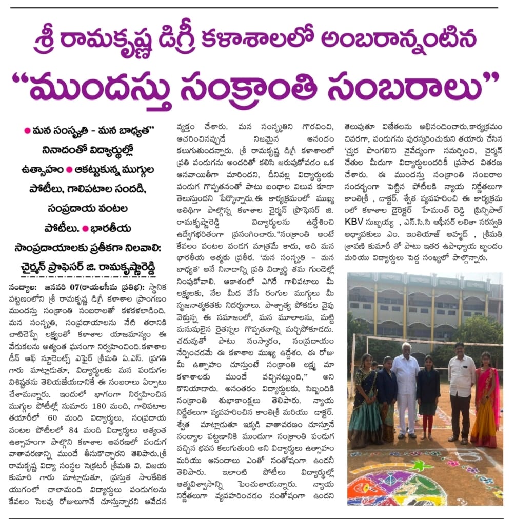 Under the aegis of the District Youth Welfare Department (SETKURU), district-level educational and intellectual talent competitions were held grandly at Sri Ramakrishna PG College. ST Commission Member Venkatappa, the chief guest, said the future of the nation lies in the hands of youth and urged them to draw inspiration from Swami Vivekananda’s messages to contribute to building an ideal society. Ramakrishna Educational Institutions Chairman Ramakrishna Reddy stated that such competitions play a key role in enhancing skills, knowledge, and social responsibility among youth, and appealed to them to stay away from drugs, alcohol, tobacco, and gutkha, which weaken the nation. SETKURU CEO Dr. Venugopal informed that suggestions on the Draft National Youth Policy available on the MY Bharat portal may be sent by youth, intellectuals, NGOs, and youth organizations to the SETKURU office email: ceosetkurur@gmail.com