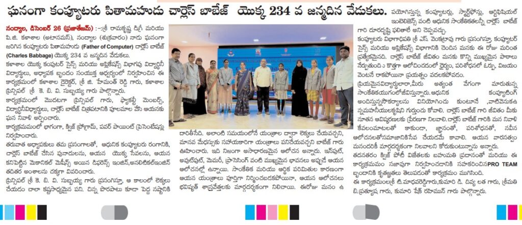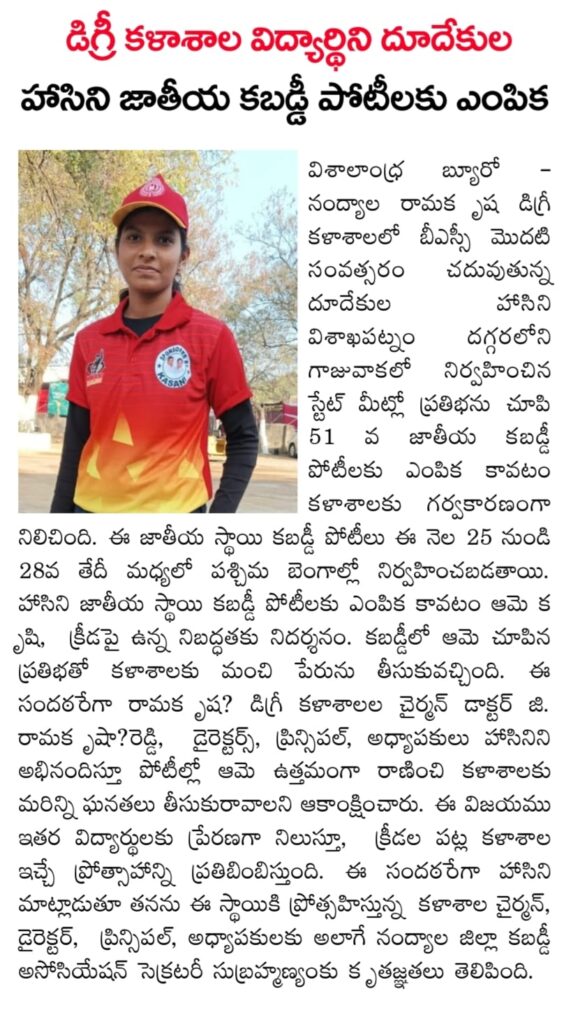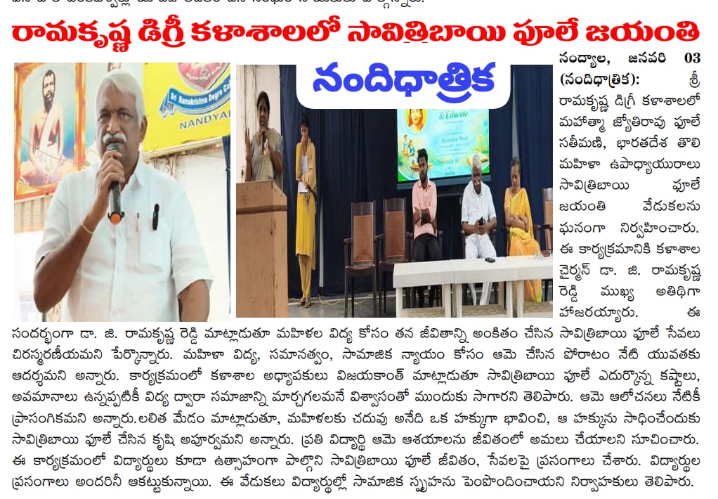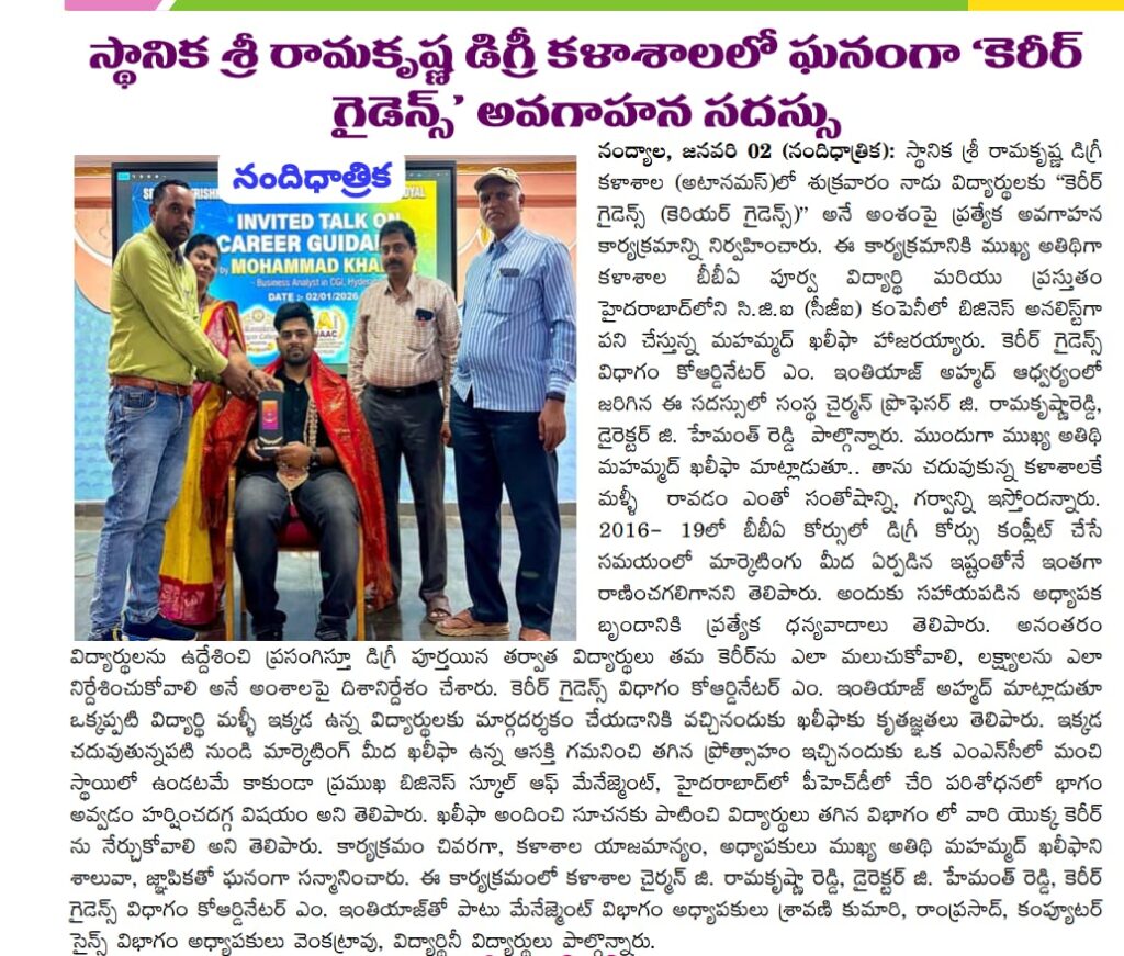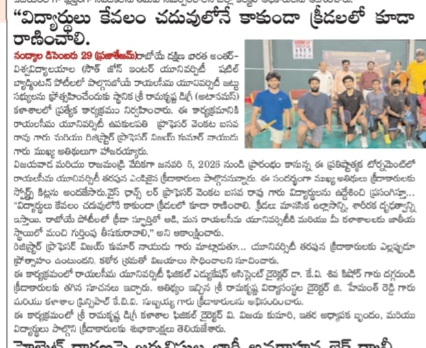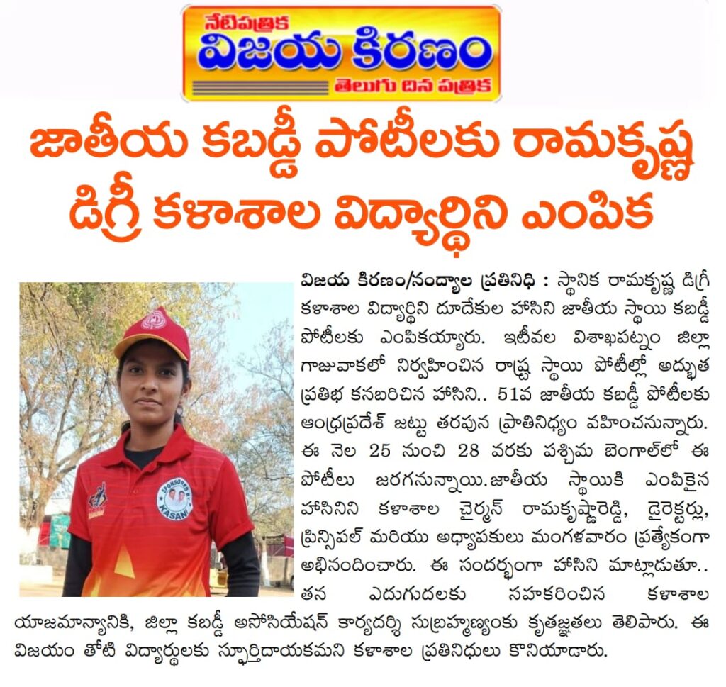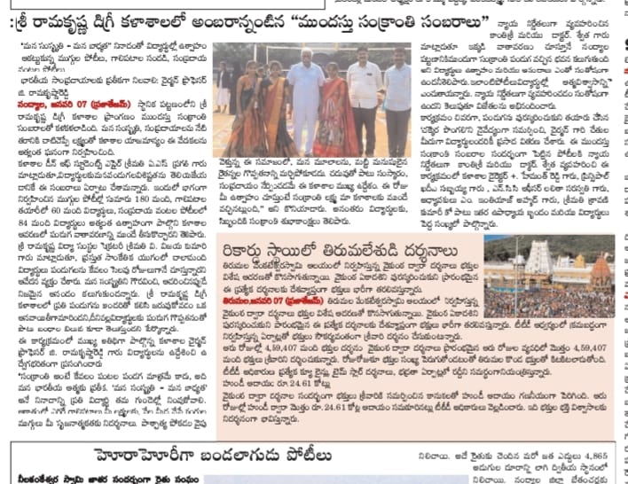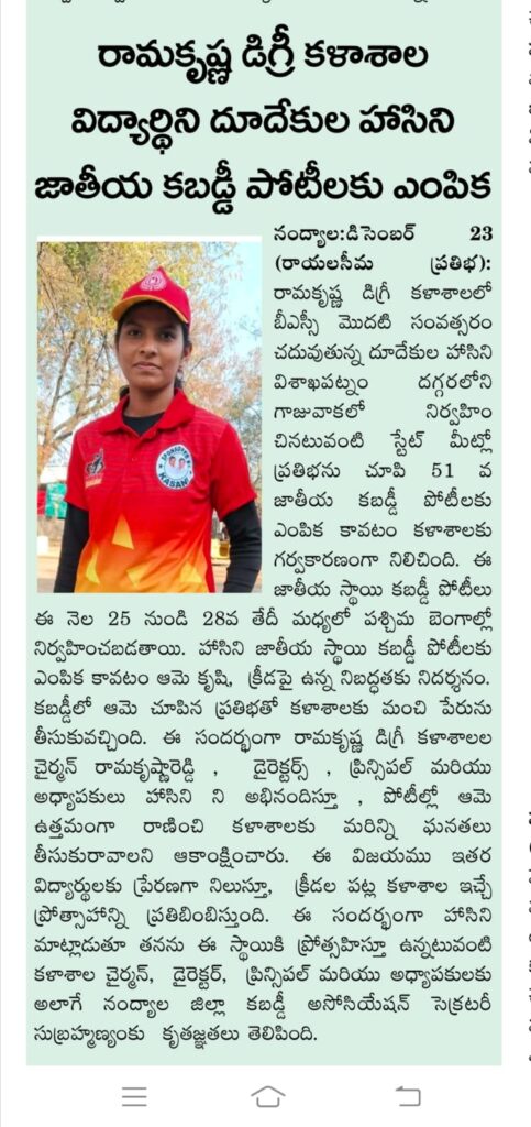 Under the aegis of the District Youth Welfare Department (SETKURU), district-level educational and intellectual talent competitions were held grandly at Sri Ramakrishna PG College. ST Commission Member Venkatappa, the chief guest, said the future of the nation lies in the hands of youth and urged them to draw inspiration from Swami Vivekananda’s messages to contribute to building an ideal society. Ramakrishna Educational Institutions Chairman Ramakrishna Reddy stated that such competitions play a key role in enhancing skills, knowledge, and social responsibility among youth, and appealed to them to stay away from drugs, alcohol, tobacco, and gutkha, which weaken the nation. SETKURU CEO Dr. Venugopal informed that suggestions on the Draft National Youth Policy available on the MY Bharat portal may be sent by youth, intellectuals, NGOs, and youth organizations to the SETKURU office email: ceosetkurur@gmail.com