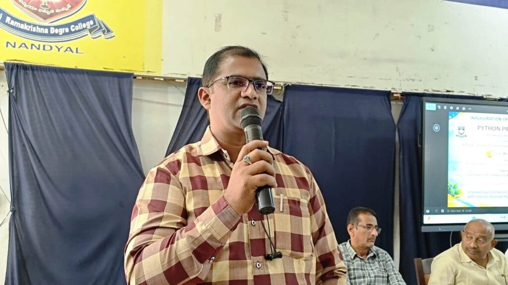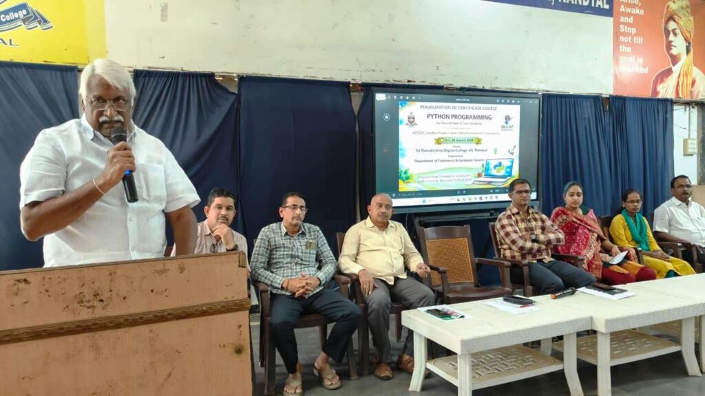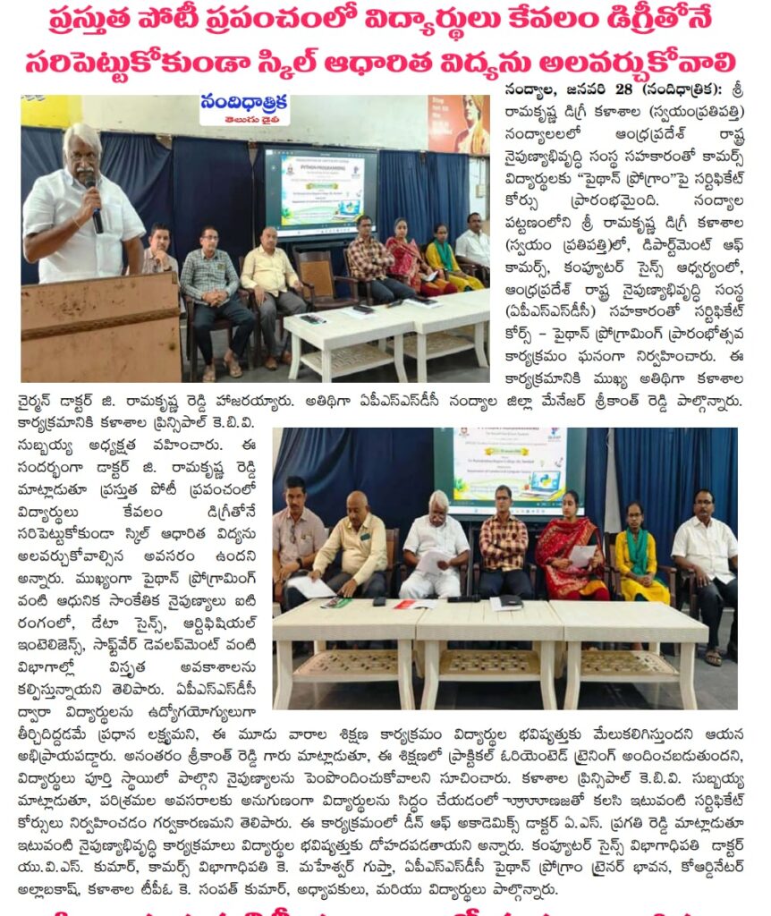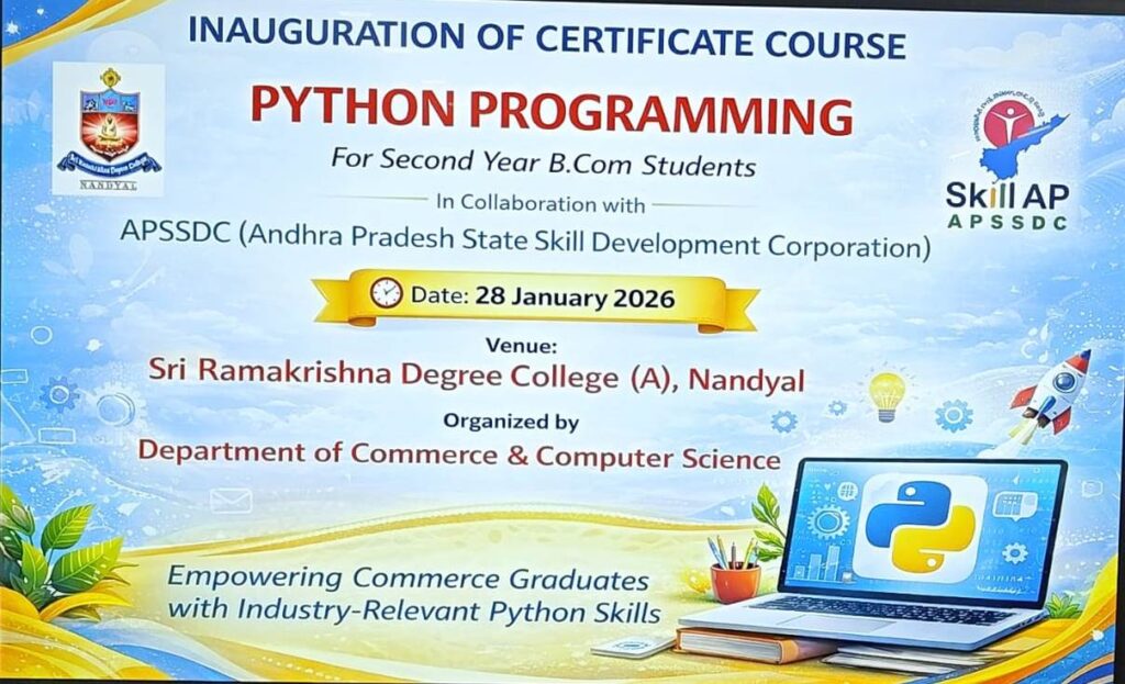 Certificate Course on “Python Program” for Commerce Students Launched at Sri Ramakrishna Degree College (Autonomous), Nandyal with the Support of APSSDCA Certificate Course on Python Programming was inaugurated for Commerce students at Sri Ramakrishna Degree College (Autonomous), Nandyal, under the guidance of the Department of Commerce and Computer Science, in collaboration with the Andhra Pradesh State Skill Development Corporation (APSSDC).The programme was inaugurated in a grand manner. College Chairman Dr. G. Ramakrishna Reddy attended the event as the Chief Guest, while Mr. Srikanth Reddy, APSSDC Nandyal District Manager, participated as the Guest of Honour. The programme was presided over by the College Principal, K.B.V. Subbaiah.On this occasion, Dr. G. Ramakrishna Reddy stated that in today’s competitive world, students should not rely only on a degree but must also develop skill-based education. He highlighted that modern technological skills like Python programming provide wide opportunities in fields such as IT, Data Science, Artificial Intelligence, and Software Development. He also mentioned that the main objective of APSSDC is to make students employable, and this three-week training programme would greatly benefit the students’ future.Later, Mr. Srikanth Reddy said that the training programme would be practical-oriented, and advised students to participate actively and enhance their skills.Principal K.B.V. Subbaiah expressed that it is a matter of pride to organize such certificate courses in collaboration with APSSDC to prepare students according to industry requirements.During the programme, Dean of Academics Dr. A.S. Pragathi Reddy mentioned that such skill development programmes would greatly support the future of students. Computer Science Head Dr. U.V.S. Kumar, Commerce Head K. Maheshwar Gupta, APSSDC Python Programme Trainer Bhavana, Coordinator Allabakash, College TPO K. Sampath Kumar, faculty members, and students also participated in the programme.