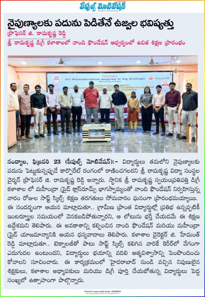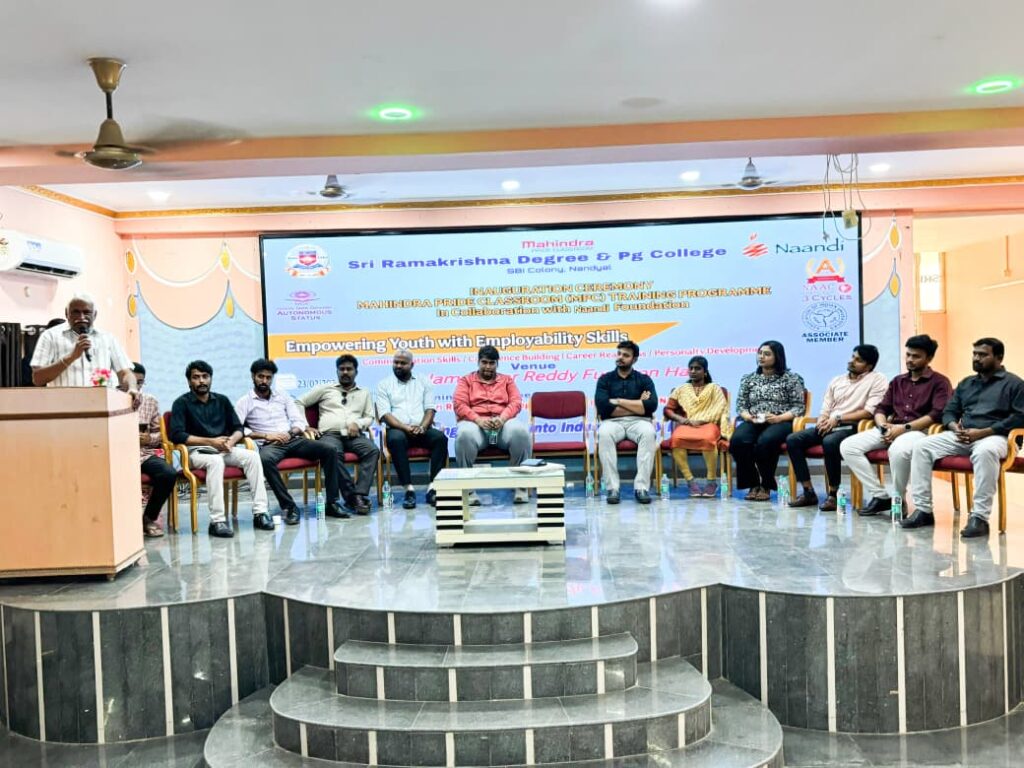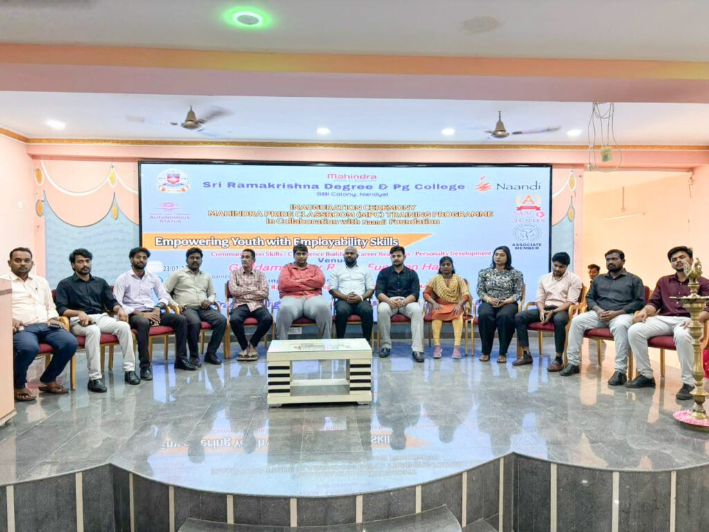 A week-long free training program on soft skills for final-year degree students was inaugurated at Sri Ramakrishna Autonomous Degree College (SBI Colony Campus), Nandyal. The program is being conducted by Nandi Foundation in collaboration with Mahindra Pride Classrooms to enhance students’ employability skills.