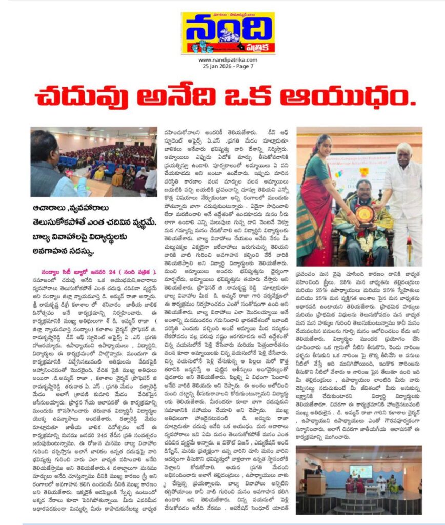 Prof. G. Ramakrishna Reddy spoke about the social causes and consequences of child marriage and advised students to focus on education and contribute positively to society.