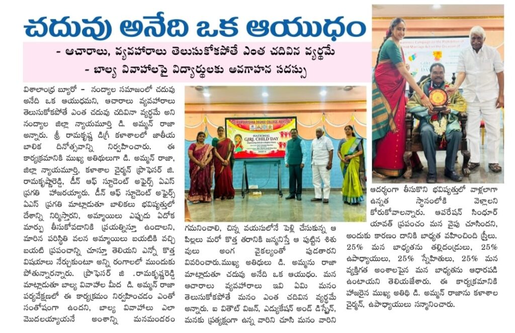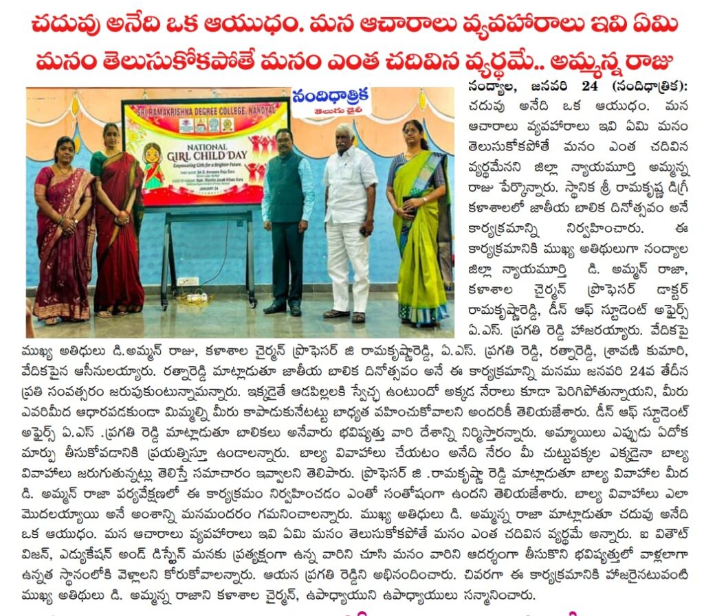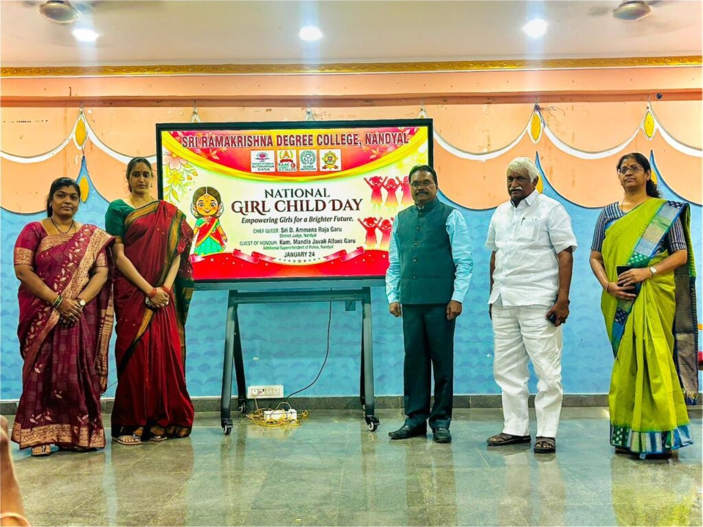 National Girl Child Day was observed on Saturday at Sri Ramakrishna Degree College, Nandyal. The programme was attended by Mr. D. Amman Raja, District Judge, Nandyal, as the chief guest. Prof. G. Ramakrishna Reddy, Chairman of the College, and Ms. A. S. Pragathi, Dean of Student Affairs, were also present.