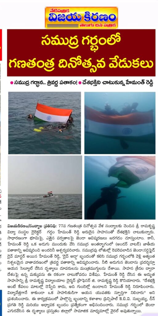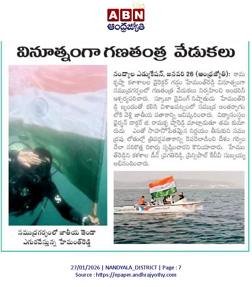 Mr. Gaddam Hemanth Reddy, Director of Sri Ramakrishna Degree Autonomous College, Nandyal, and a renowned certified scuba diving Dive Master, amazed everyone this year by celebrating Republic Day in an exceptionally innovative manner.