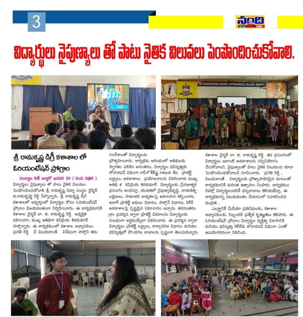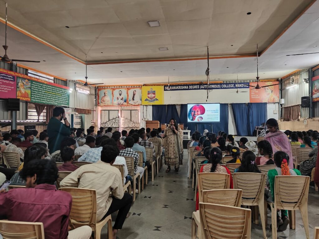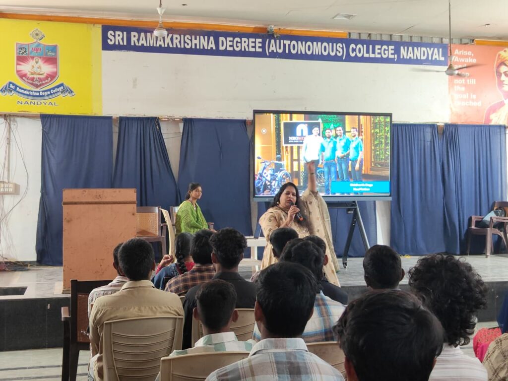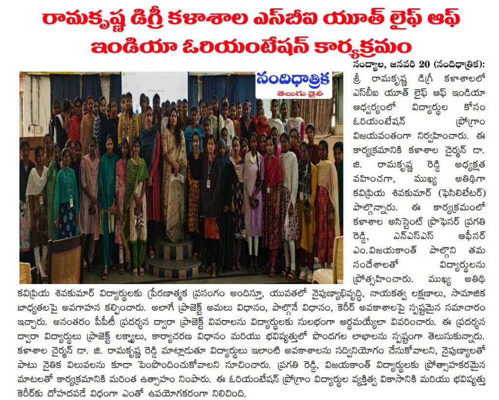 An orientation programme on SBI Youth Life of India was successfully conducted at Sri Ramakrishna Degree College for the benefit of students. The programme was presided over by the College Chairman Dr. G. Ramakrishna Reddy, with Mr. Kavipriya Shivakumar (Facilitator) as the chief guest.