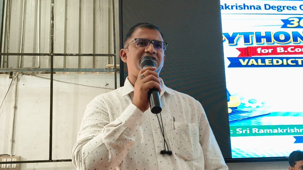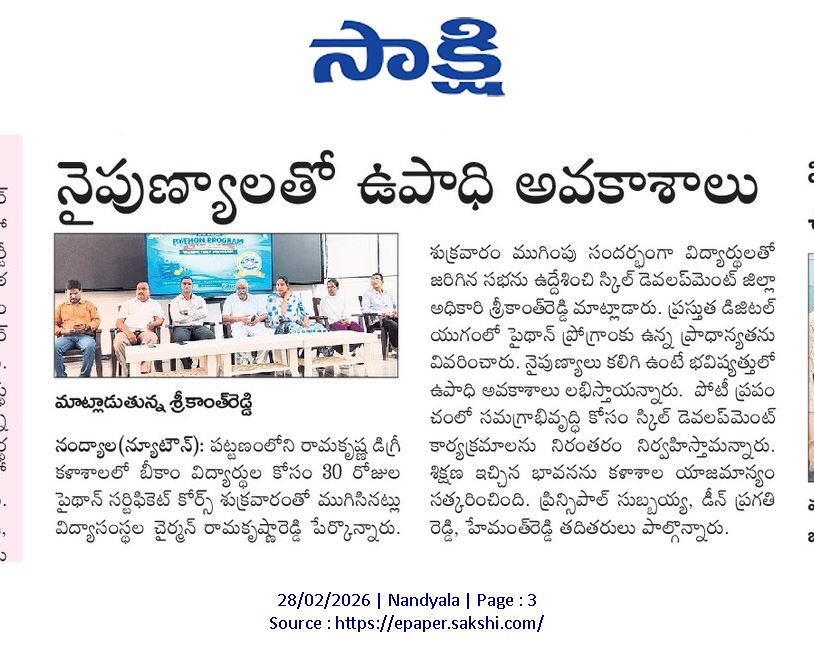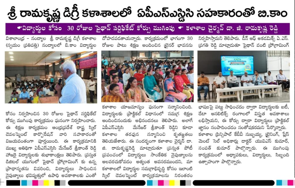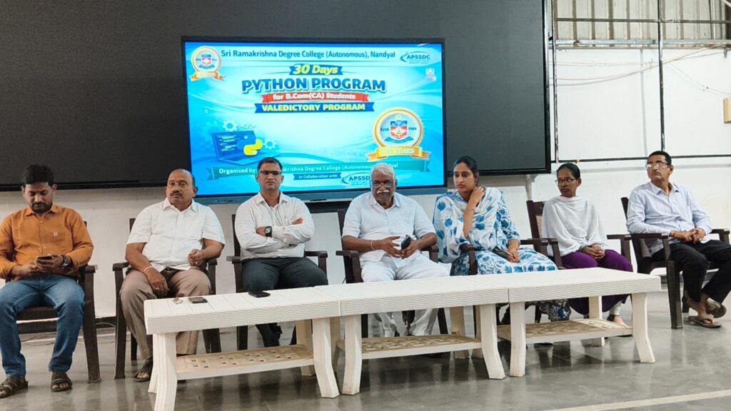 The valedictory ceremony of a 30-day Python Certificate Course आयोजित for B.Com students was held successfully at Sri Ramakrishna Autonomous Degree College, Nandyal, in collaboration with the Andhra Pradesh State Skill Development Corporation (APSSDC).